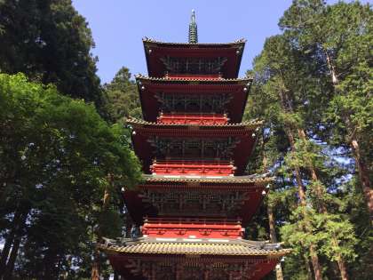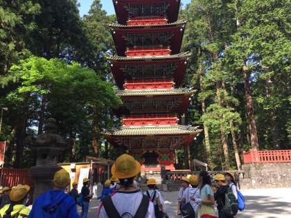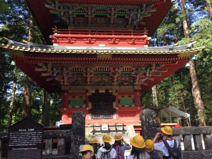 五重塔を見学しています。五重塔には干支が彫刻されています。子どもたちの干支は…なんと裏側…残念ながらみることができませんでした!
