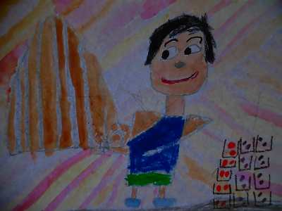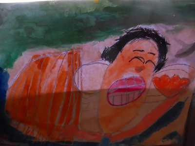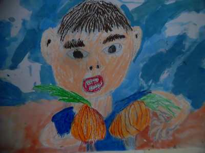 収穫して嬉しかった気持ちを絵に表現しました。大きいたまねぎがとれて嬉しかった子は大きなたまねぎを描き、たくさんとれたことが嬉しかった子はたくさんのたまねぎを描きました。