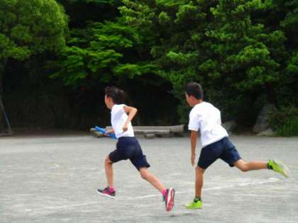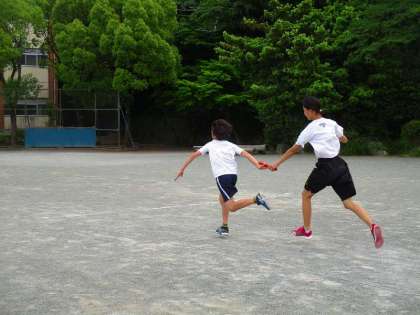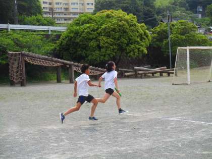 子どもたちは、バトンパスを繰り返し練習を行い、なるべくタイムロスを少なくしてバトンを渡せるように努力しました。上手くできると子どもたちは喜びを感じ、