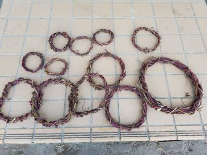 収穫後のさつまいものツルを集めて、葉をとり、輪になるように束ねて、クリスマスリースの土台をを作りました。このあとはきれいに装飾します。