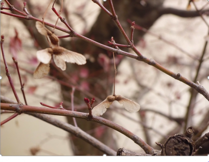 確かに寒さの厳しい時期ですが、職員玄関前のウメの花もほころび、次々と白い花が咲き始めています。もうじき花の香りも楽しめそうです。もみじはすっかり葉を落としましたが、よく見るとグライダーのような種が・・・命が受け継がれているんですね。