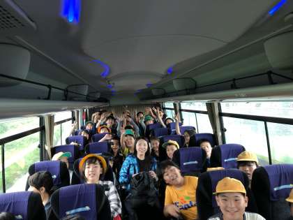 バスの中の様子です。この2日間で何が一番楽しみかという話題で盛り上がっています。もうすぐふれあいの村に到着します。