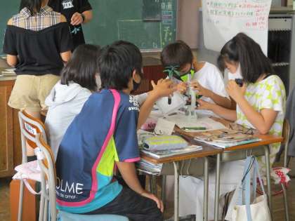 6年生の教室に行ったとき、理科で植物(ホウセンカ)の水の通り道の学習をしていました。色水を根から吸わせたホウセンカの茎や葉などを子どもたちは観察していました。顕微鏡も準備しどうやったら見ることができるか悪戦苦闘していました。