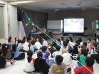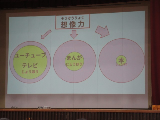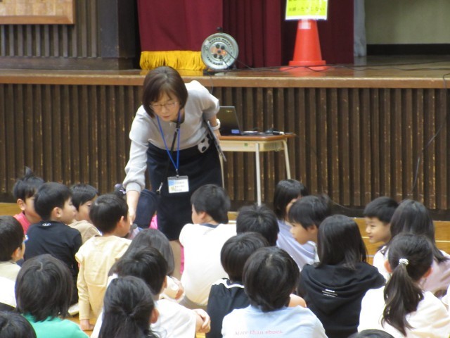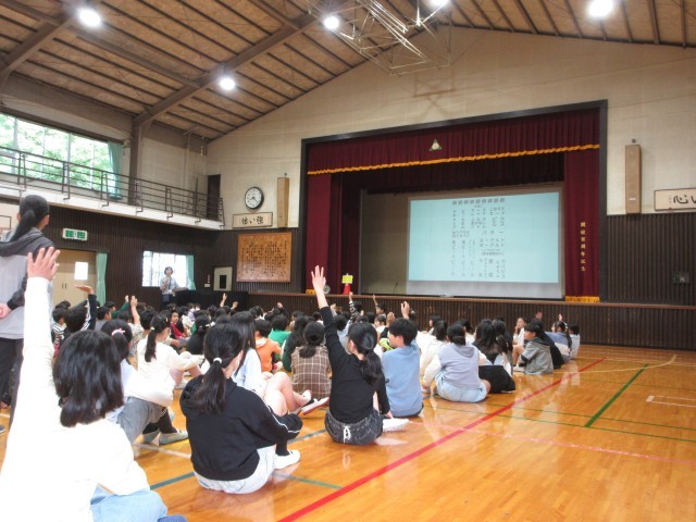 朝の時間は、今年度着任した職員による話の時間でした。今回は、校長が担当でした。内容は、頭を働かせて想像しながら考えることの楽しさを味わえるものでした。例えば、品物名の書かれたスライドを見て何を表しているのか考えたり(答えは、冷蔵庫)、示された文章の後にどんな文が来るを考えたりする問題を紹介されました。参加した児童や職員は、「あー、そっかー!」「あー、なるほど!」と、盛り上がりました。