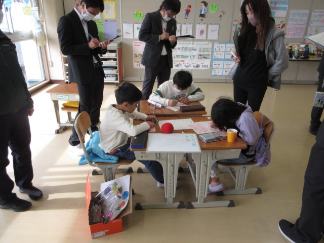 また、1年生の担任が校内研究で授業提案をしました。教科は、生活科です。来週、学区の保育園児さんを招待し、交流をするので、その準備を進める学習でした。それぞれが園児さんに紹介したい遊びについてわかりやすく紹介をする内容を考える学習でしたが、「園児さんに分かりやすく」を子ども達は常に意識し、園児さんの立場になって考えることができていることに、参観した職員は感心していました。きっと保育園の園児さんも喜んでくれと思います。