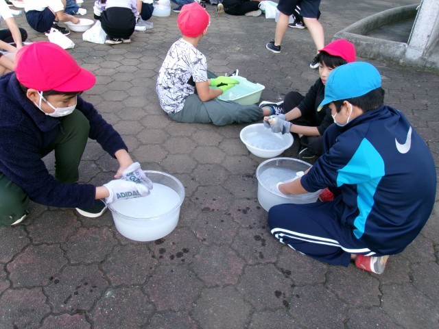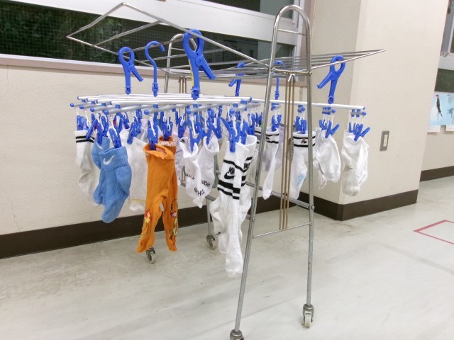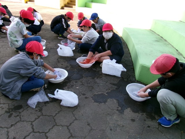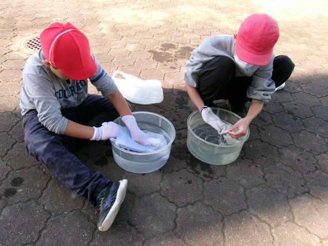 今日は、お日柄もよく、絶好の洗濯日和でした。ということで、6年生の子ども達が外で靴下を洗濯していました。なかには洗濯板を使っている児童もいましたが、やはり手洗いは大変そうでした。靴下でも綺麗に洗うのが大変なのに、昔の人は服や大きな布なども手洗いしていたのだと考えると、その苦労さに頭が下がります。家事の大変さを感じるとともに、「家族を手伝おう・・・」という気持ちを持てるといいなと思います。