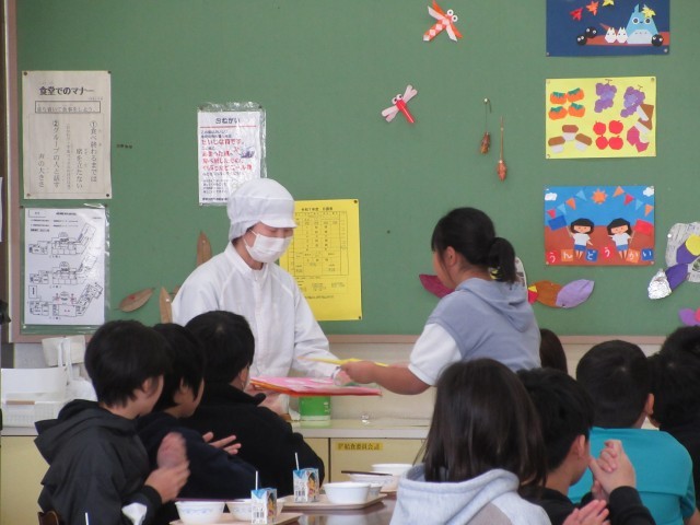 下曽我小学校で長く働いてくださった「給食受入れ職員」の方が、最後の勤務日となってしまいました。給食の時間に食堂で「お別れ会、感謝の会」を開きました。各学年の児童がメッセージを書き、代表の児童が渡しました。子ども達が美味しく安全に食べることができるように毎日準備をしてくださり、本当にありがとうございました!