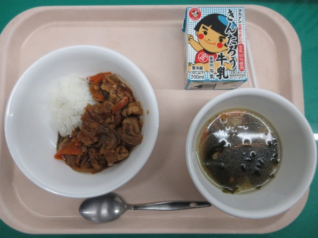 今日の給食は、牛乳、プルコギ丼、とりだしスープでした。プルコギは甘い味付けで、肉もたっぷり!子ども達は黙々と美味しそうに食べていました。