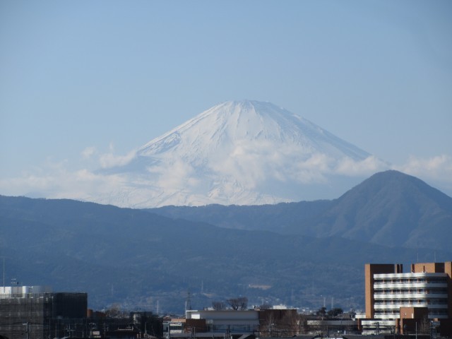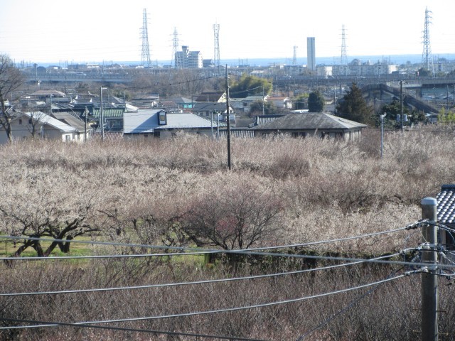(3階から見える富士山と梅林の景色です。場所により開花に差がありますが、梅の花が咲き始めています。)