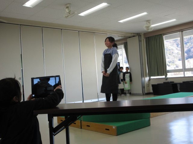 5年生は、家庭科で作ったエプロンをファッション・ショー風に発表しました。ランウエイでは、恥ずかしそうな子もいましたが一言メッセージを添えて披露しました。