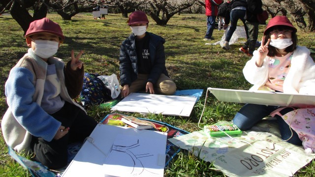 1、2、4年生が下曽我の梅林へ出かけ、梅の写生をしました。天気に恵まれ、ぽかぽか陽気のなか、じっくりと梅を眺めて絵を描いていました。