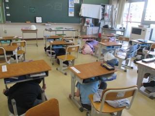 地震と火災の避難訓練を行いました。放送を聞いて素早く机の下にもぐることができていました。