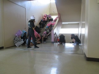 また、余震が起きた場合を想定した訓練も行いました。避難の途中で余震が起きた時には、シェイクアウトの姿勢で落ち着いて避難することを訓練しました。