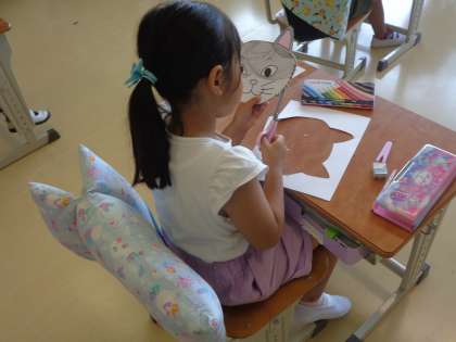 1年生は、国語の学習で使うグッツを作っています。かわいいお面を上手に仕上げていました。