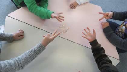 1年生が7名の地域のおじいちゃん・おばあちゃんから昔の遊びを教えていただきました。お手玉・あやとり・福笑い・将棋・ぼうずめくり・すごろく・おはじきです。また、体育館では羽つき・ゴムとび、外ではコマまわしを楽しみました。