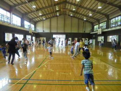 じゃんけん列車、しっぽとり、大きな輪になっての自己紹介などの活動を親子で楽しみました。お互いのことをさらに知ることもできたようです。