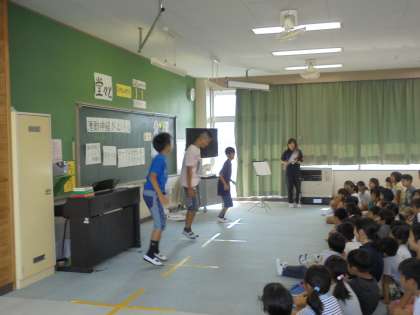 今日の朝会はなかよし級の武田先生のお話。運動が得意な先生が、運動が得意になる方法を教えてくれました。