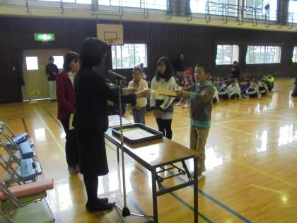 12月10日、音楽朝会がありました。1月の感謝の会で歌う「世界がひとつになるまで」の練習をしました。6年生が合奏し、1〜5年生が歌いました。その後、読書感想文の表彰もありました。
