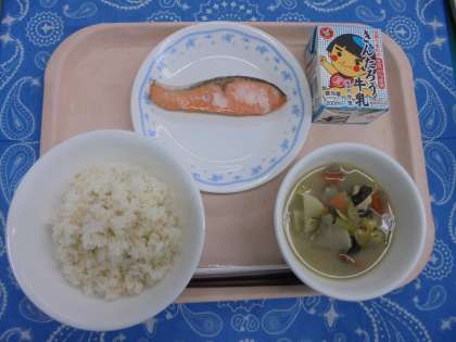 献立 牛乳 麦入りご飯 鮭の塩焼き さつま汁