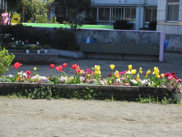 春の暖かい日が続き、美しい花々が咲いています。桜のそばでは、多くのクラスが学級写真を撮っていました。花壇には、花ボランティアの方が植えてくださった花々がとても綺麗に咲いています。春の素敵な風景です。