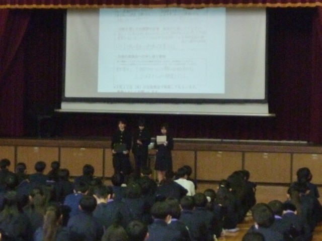 生徒会本部役員をはじめ、それぞれの委員会が後期の活動の振り返りを発表しました。2年生が主体となって、うまくいったこともいかなかったことも来年に生かそうとしています。より良い学校にするために、全校生徒が協力体制を大事にしていきたいですね。