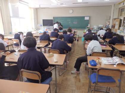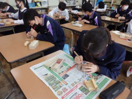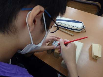 3校時、北館2Fの美術室では、3年生が篆刻を行なっていました。全員が小さくて硬い石を削ることに集中して取り組んでいます。