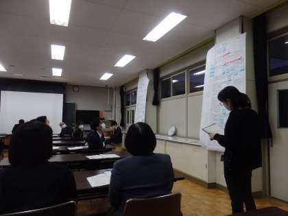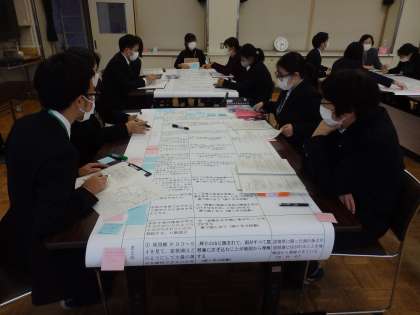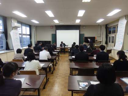 15時10分より北館3Fの図書室と多目的ホールを会場にして、研究授業後の話し合いが行なわれています。授業の中で生徒の変容のようすを中心に、深い学びを追究していきます。