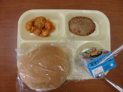 照り焼きハンバーガーにポークビーンズでした。昼休みに3年生の男子生徒に感想を聞くと、ハンバーグは肉がぎっしり詰まっていて食べ応えがあり、ソースもトロトロで良かったです、ハンバーグをはさむパンが大きくて、食べはじめはパンばかり食べている感じがしました、ハンバーグを大きくするか、パンを小さくしてサイズを合わせてほしいです、と言っていました。
