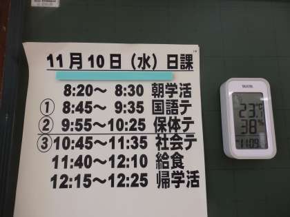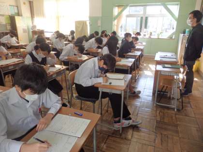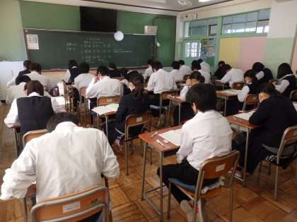 2校時、南館2Fの3年生の教室では、3回目の定期テストが行なわれていました。教室内の気温は23度、湿度は38%で、少し乾燥気味でしたが、受験に適した環境の中で、生徒たちは集中してテストに取り組んでいました。