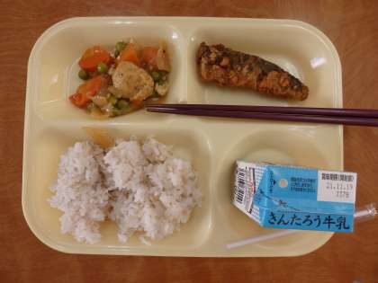 かます棒の竜田揚げにがんもどきの煮物です。主食は麦入りご飯でした。放課後に3年生の男子生徒に感想を聞くと、魚は肉厚で食べ応えがあり、身はホロホロ、濃い味付けの魚本来の味がして美味しかったです、がんもどきはサクッという食感で枝豆もあり色とりどりで、タレが染みたタマネギもとても美味しかったです、と答えてくれました。