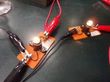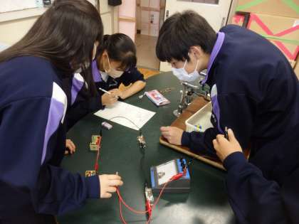 6校時、北館2Fの第2理科室では、2年生の理科の授業が行なわれていました。直列と並列回路を組んで各地点を流れる電流の大きさを測定しています。