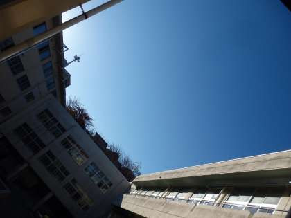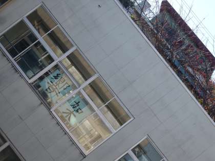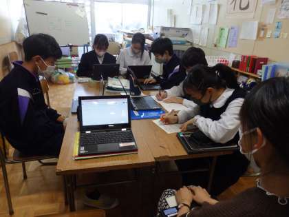 放課後、北館3Fの生徒会室で、生徒会の総務部が集まって話し合いを行なっています。中庭の渡り廊下の窓には、生徒会目標の「響架」の文字が掲げられています。