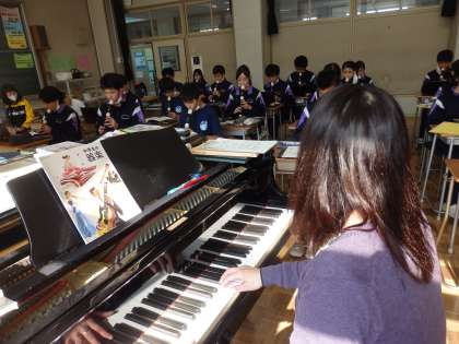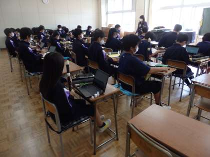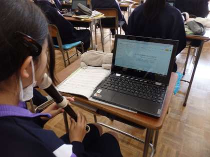 3校時、北館3Fの第1音楽室で、1年生がクロームブックを活用した音楽の授業を行なっていました。クロームブックには今日の意気込み、工夫したところ、反省等を記録しています。