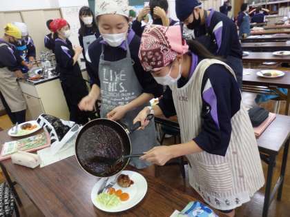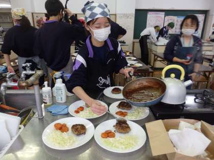 5・6校時、北館1Fの調理室では、3年生が去年できなかったハンバーグの調理実習を行なっていました。実習を終えた3年生の男子生徒は楽しかったです、普段からやらなければいけないなと思いましたと言っていました。