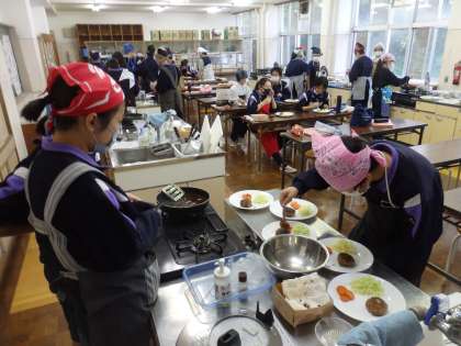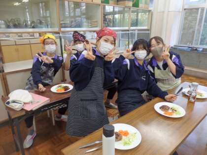 1・2校時、北館1Fの調理室で、3年生の調理実習が行なわれていました。出来上がったハンバーグはふっくらとしてとても美味しかったです。