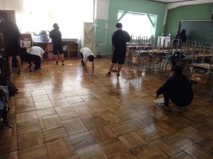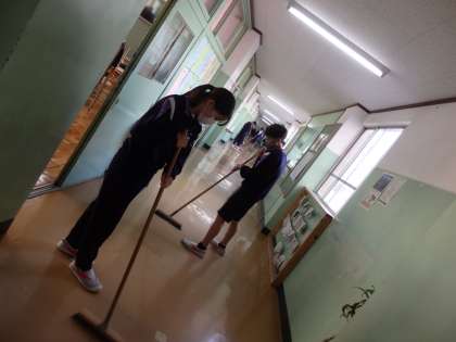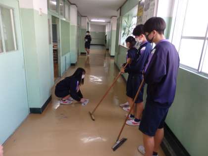 南館2Fのフロアは、3年生が清掃を行なっています。教室は少ない人数で効率よく進めていて10分間で最後まで終わらせることができています。