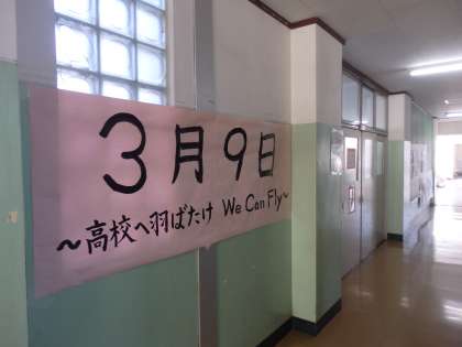南館2Fの廊下に3年生の後期目標が掲示されています。いくつかの候補から学年全員の投票によって決まったものです。