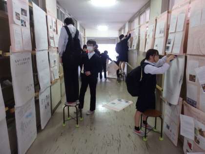 北館2Fの理科室前に展示していた自由研究を3年生の理科係が片付けています。10月の学習発表会校内展示期間から今まで展示されていたものです。