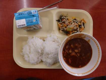 ハヤシライスに野菜のイタリアンドレッシング炒めでした。下校しようとしていた2年生の男子生徒に感想を聞くと、僕は野菜とご飯をソースに入れて食べるんです、ソースに野菜が少ないのと、早く食べられるので、とても美味しいです、と言っていました。
