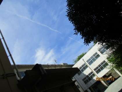 北校舎と南校舎に挟まれた中庭から見上げた空に、一本の飛行機雲ができていました。「飛行機雲がすぐに消えると晴れ」という観天望気もありますが、明日の天気はどうなることでしょう。
