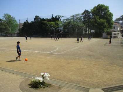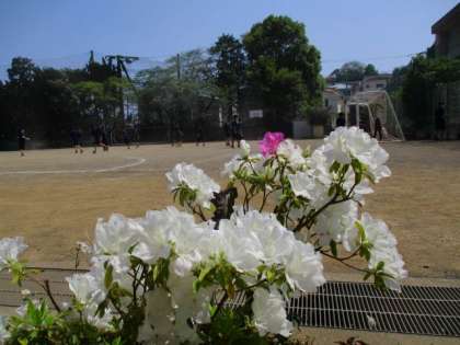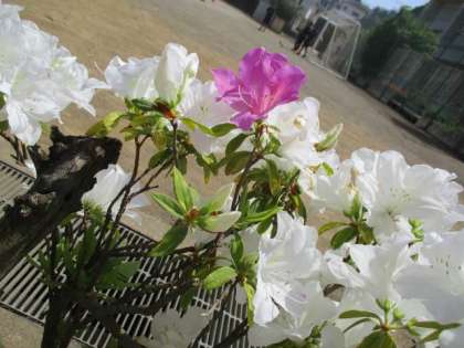 グラウンドの端に咲いている白いツツジの中に、ピンクの花が一輪混じっていました。白い花は、突然変異で白く咲いたものを改良したものなので、部分的にピンクが混じることがあるそうです。