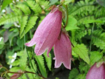 グランド横の階段の植え込みに咲くホタルブクロ(ツリガネソウ)です。名前の由来は、提灯の古名「火垂(ほたる)」にちなむそうで、別名を釣鐘草(ツリガネソウ)といいます。 英名はベルフラワー(bell flower)です。
