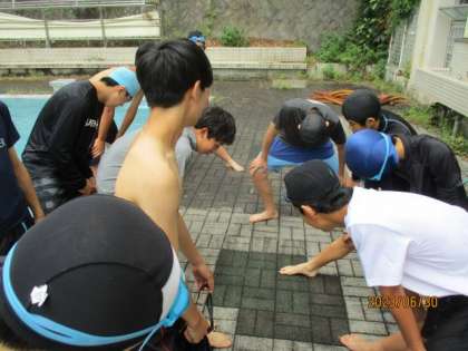 4校時、屋外プールで、2年生の水泳の授業が行われていました。途中小雨が降ってきましたが、生徒たちは久しぶりの水泳を楽しんでいます。今週から始まった水泳の授業は、夏休みをはさんで9月まで行われます。