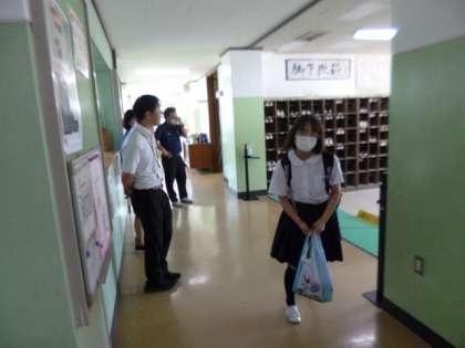 朝、正門や昇降口で、先生たちが登校してくる生徒たちに声をかけています。中には胸の校章を付け忘れている生徒がいて、忘れないように指導されていました。