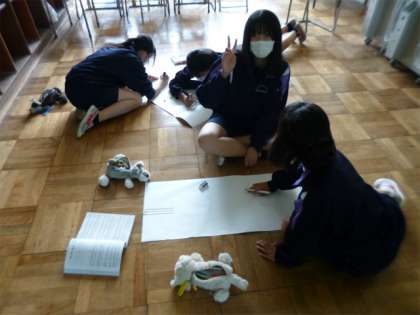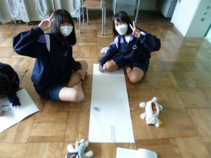 昼休み、南校舎3Fの教室で、2年生の生徒が合唱発表会のめくり作りをしています。模造紙を縦に半分にした紙に、学年、組、合唱曲名を描いています。19日合唱発表会の当日、三の丸ホールで掲示する予定です。