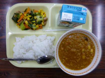 豆とひき肉のカレーにチンゲン菜のソテーでした。放課後にグラウンドで部活動をしていた1・2年生の生徒たちは、美味しかったですがカレーのルーが少なかったです、いつもはカレーを麺につけて食べるのに、今日はご飯でした、牛乳は美味しかったですが、サラダは美味しくありませんでした、サラダにコーンが多過ぎます、カレーに豆は要りません、温野菜ではなく生野菜が食べたいです、と言っていました。