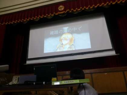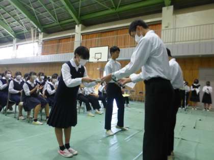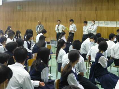 9時20分、体育館2Fアリーナで、予定通りに学習発表会が始まりました。開会式では、スローガンとシンボルマークの発案者への表彰が行われました。美術部の動画による発表の後は、生徒会長が先生方にインタビューをし、中学時代の青春について話をいただきました。
