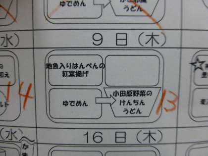 小田原野菜のけんちんうどんと地魚入りはんぺんの紅葉揚げでした。放課後の委員会活動を終えた1年生の男子生徒は、もみじ揚げのはんぺんが美味しかったですと言っていました。
