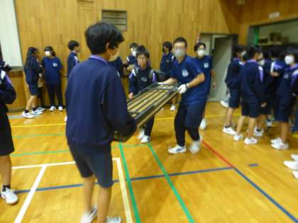 放課後の体育館では、部活動に所属している生徒たちが明日のバザーに向けた準備を行いました。。委員会ごとに割り当てられたブースに必要な椅子や机を運びます。バザーは明日土曜日の午後に予定されています。