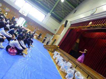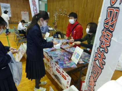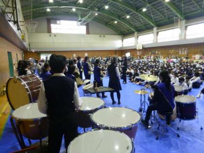 午後から体育館で、生徒と保護者、地域の皆さんが参加してPTAふれあいバザーが開催されました。開会式ではフラダンスや吹奏楽部の演奏でバザーの開催を盛り上げました。
